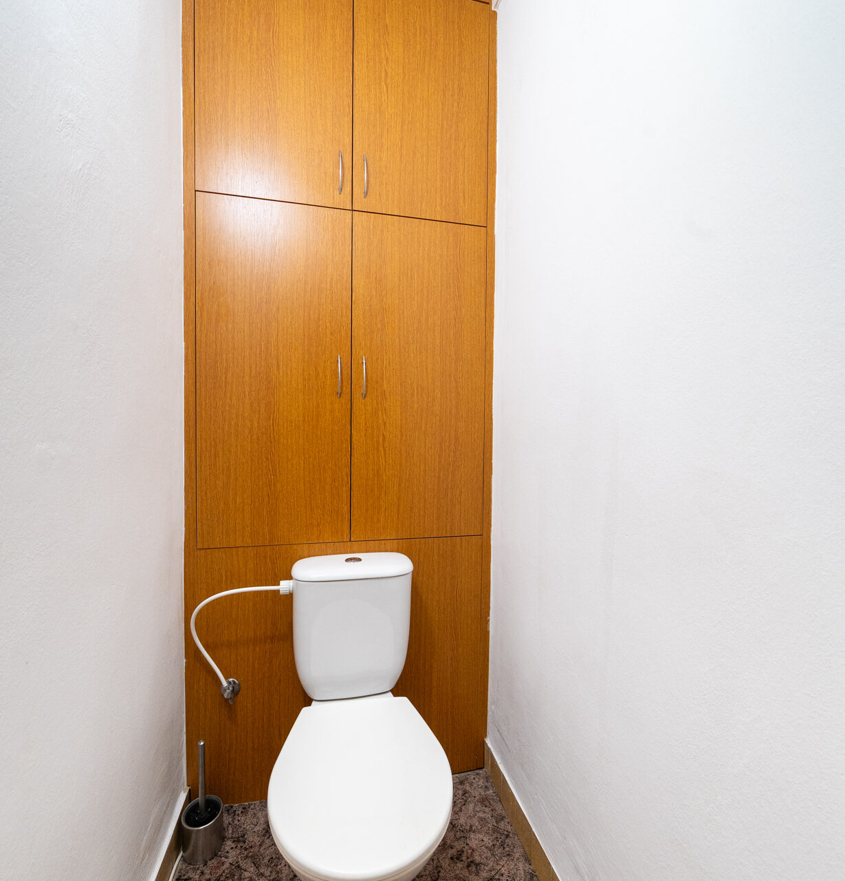 Koupelna je vybavena vanou, umyvadlem, úložnou skříňkou a pračkou. Toaleta je umístěna samostatně.