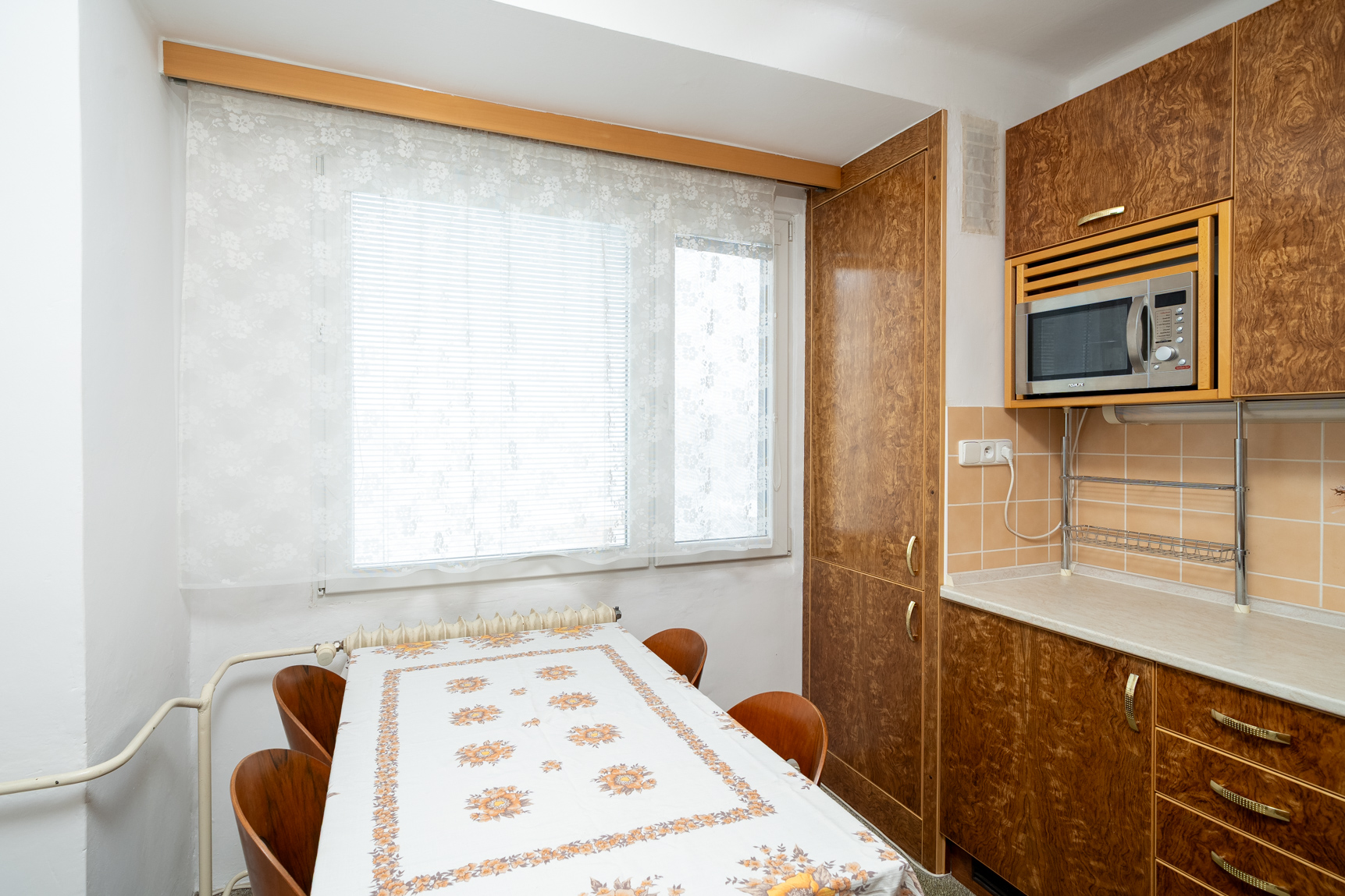 Kuchyně je světlá a udržovaná, nabízí dostatek úložného prostoru i pracovní plochy. Je vybavena plynovou varnou deskou, elektrickou troubou, digestoří a vestavnou mikrovlnnou troubou. Součástí je také příjemná jídelní část u okna.